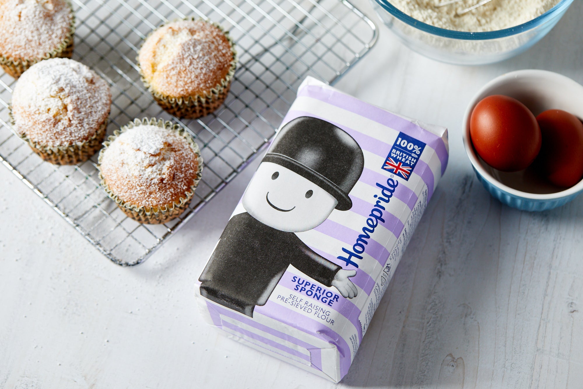 100% British Wheat Flour (Wheat Flour, Calcium Carbonate, Iron, Niacin, Thiamin), Raising Agents: Sodium Hydgrogen Carbonate, Disodium Diphosphate, Monocalcium Phosphate